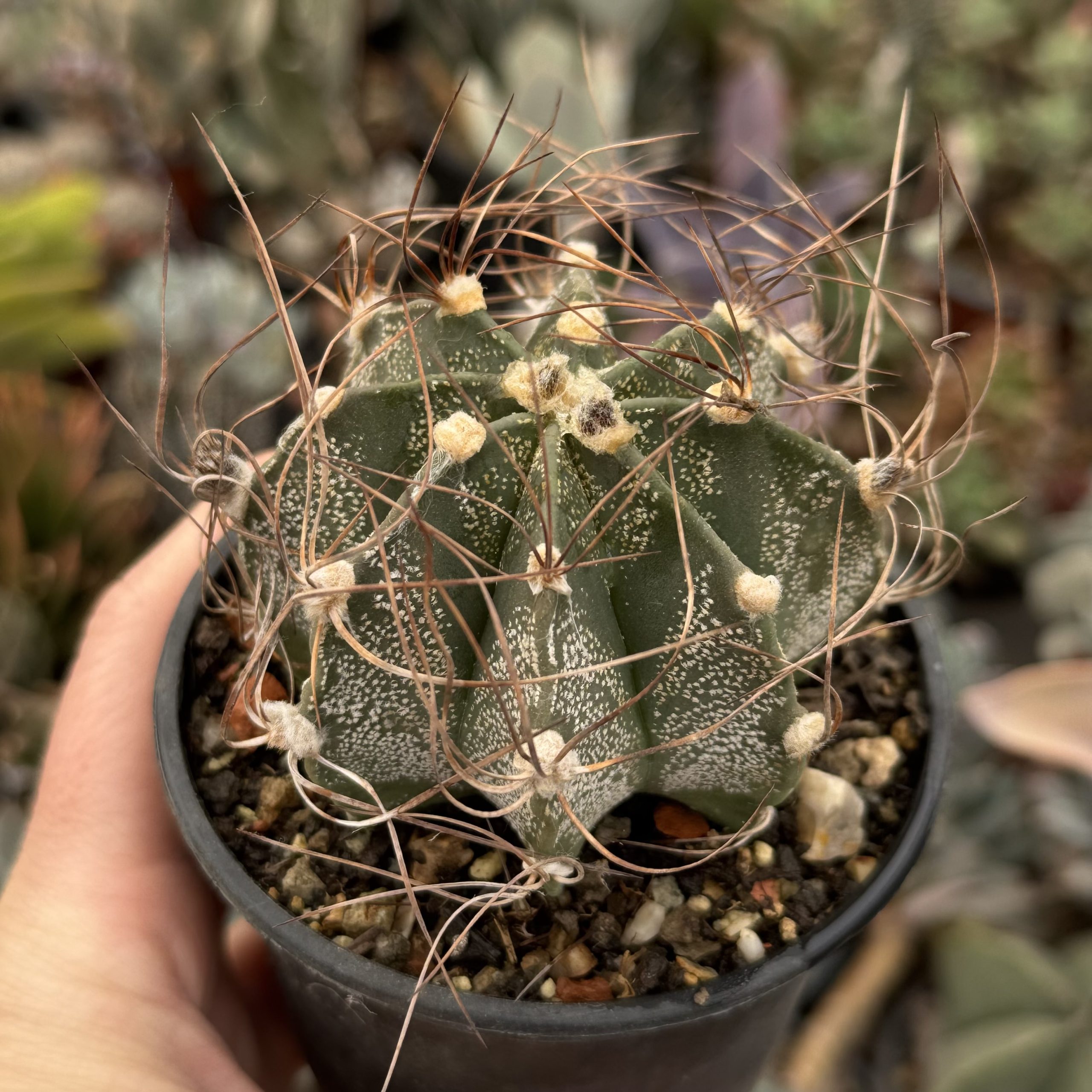 Acest cactus vine dintr-o combinatie perfecta capricorne-senile si calupul de „spini” adica de fire este spre varful plantei, nu pe toata planta, cum este de obicei la ambele variante.