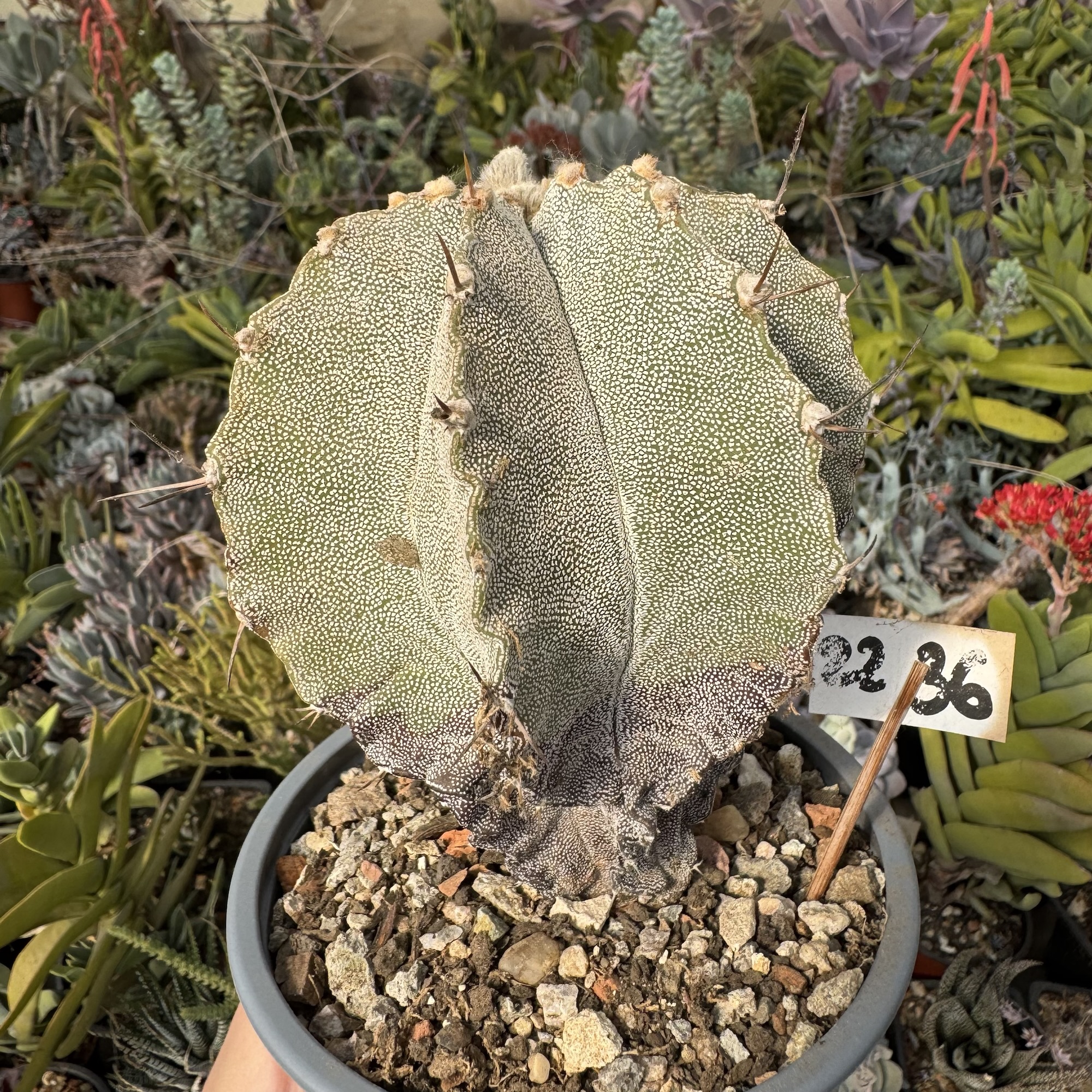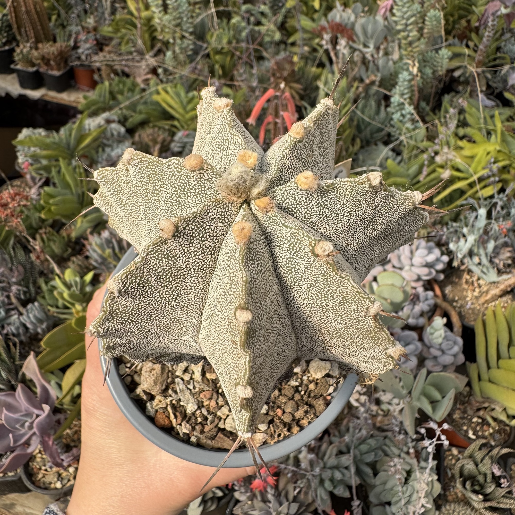 Cactus unic, hibrid, o combinație perfectă între un Astro simplu și un ornatum, dar rămâne momentan nedenumit. Forma este subțire la bază și rotundă în sus, ceea ce va rămâne la fel în toată viața lui. A ajuns la maturitate deja de câțiva ani, așa că înflorirea este în fiecare an. La cactușii care provin din ornatum, de regulă înflorirea se întâmplă după vârsta de 10 ani, iar apoi, în fiecare an. Cactusul din imagine este considerabil mai mare ecat la momentul in care a fost facuta poza, fiind model pentru floare.