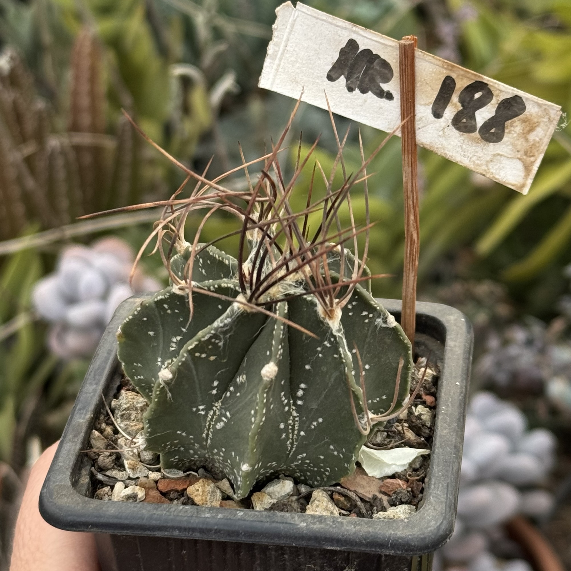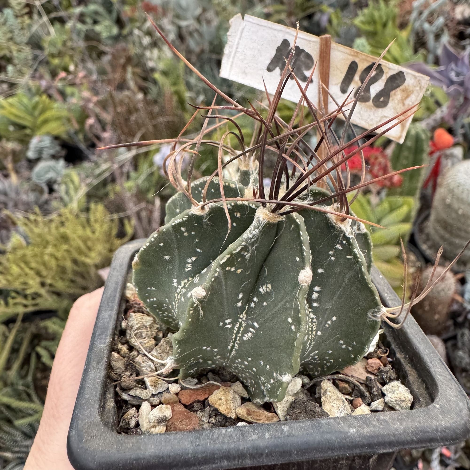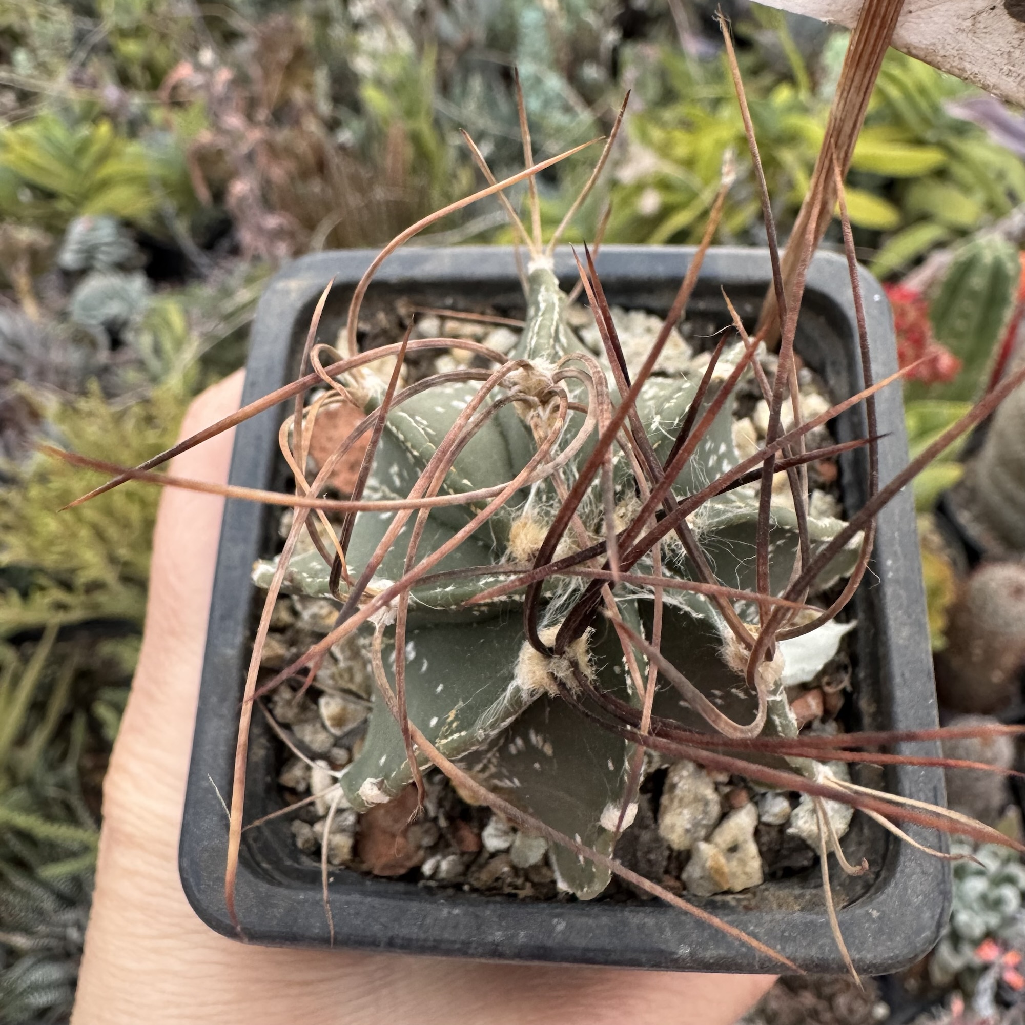 Astrophytum senile hibrid este un cactus spectaculos, apreciat pentru forma sa geometrică și pentru spinii lungi, răsuciți, care îi oferă un aspect unic, aproape sculptural. Exemplarul de față are o vârstă estimată de 6 ani și este crescut lent, natural, fără forțări.