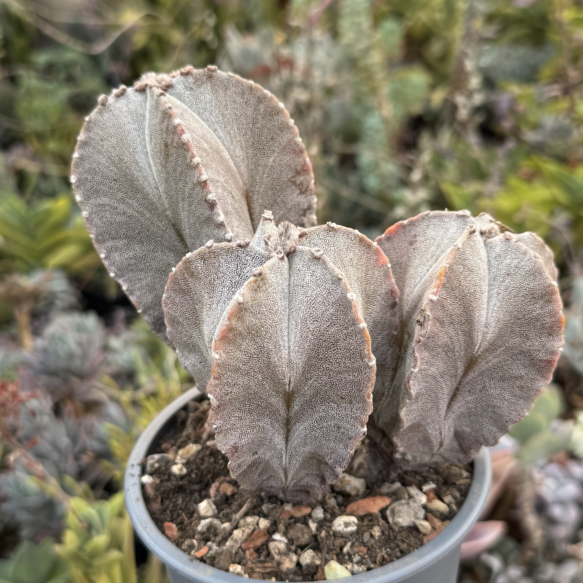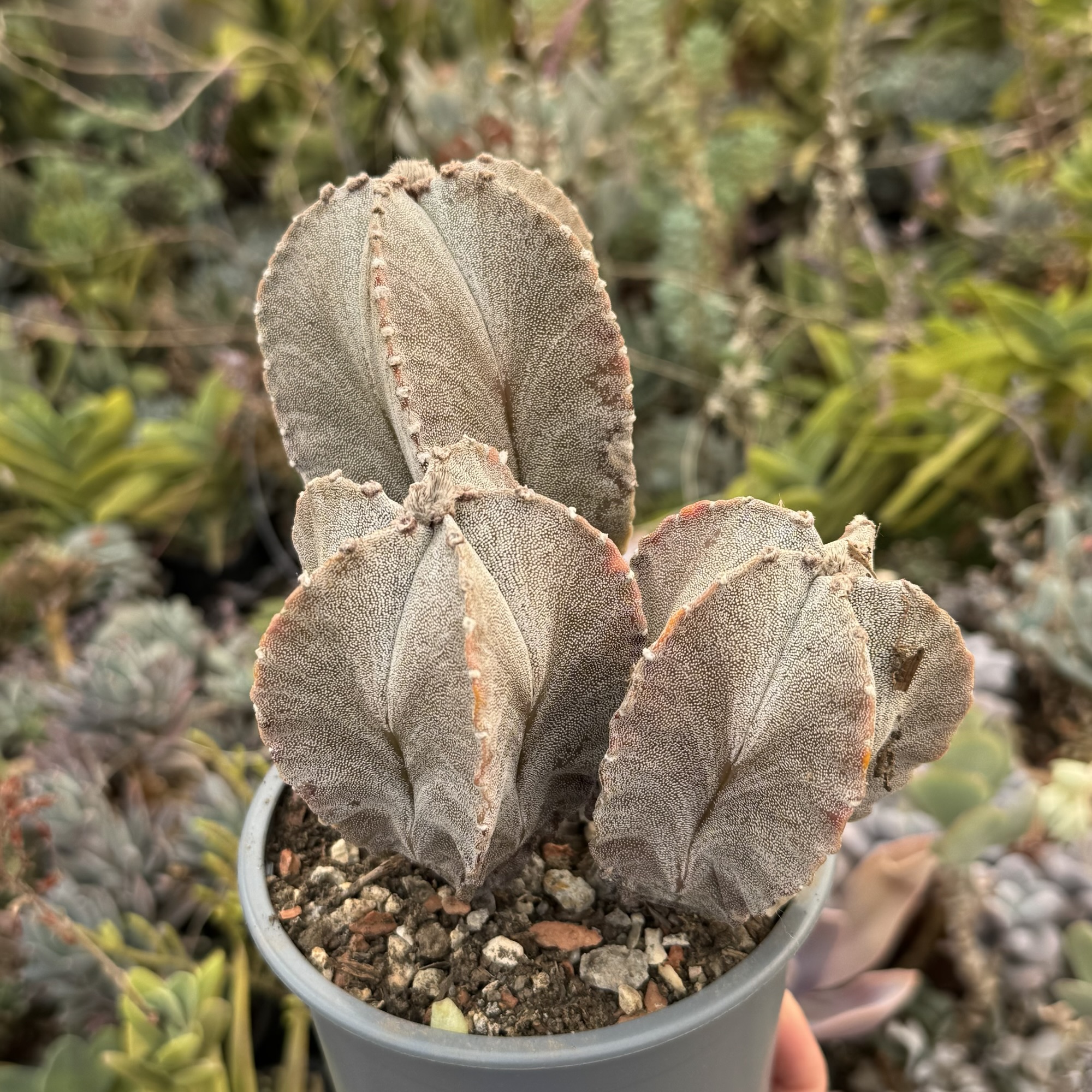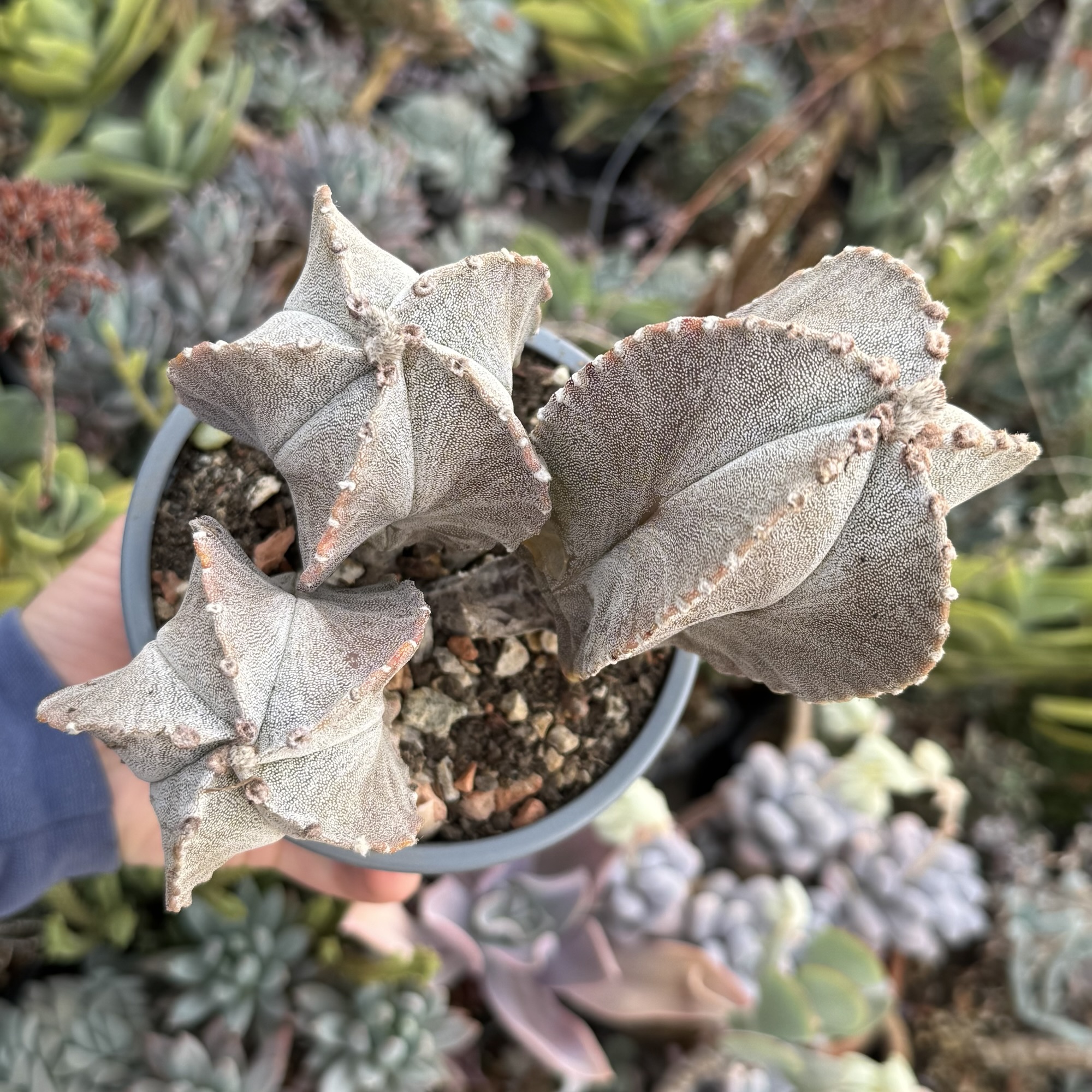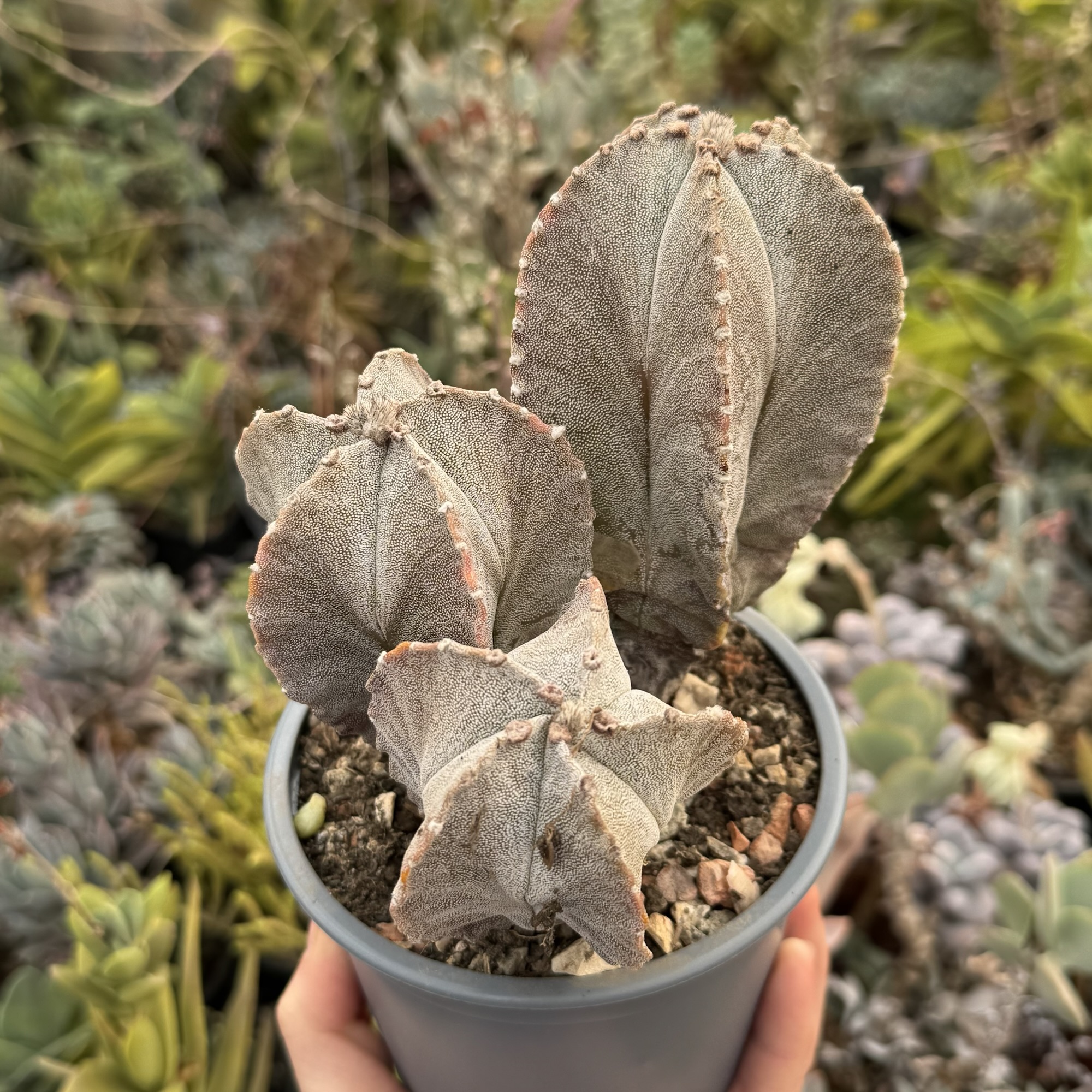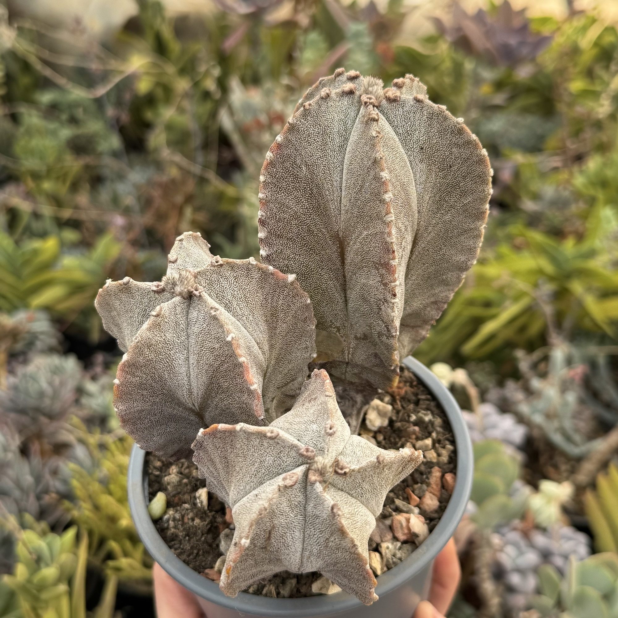 Exemplar spectaculos de Astrophytum matur, format natural în 3 capete de dimensiuni diferite, ceea ce îi oferă un aspect sculptural și deosebit. Corpul plantei este bine dezvoltat, cu coaste pronunțate și textura specifică genului, decorată cu puncte/albicioare naturale.