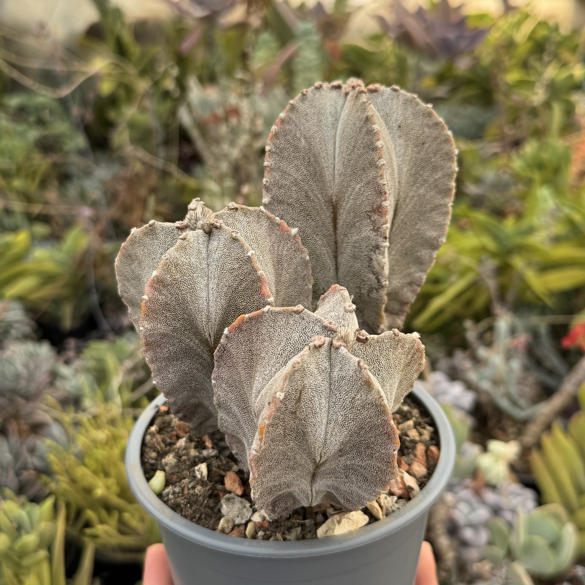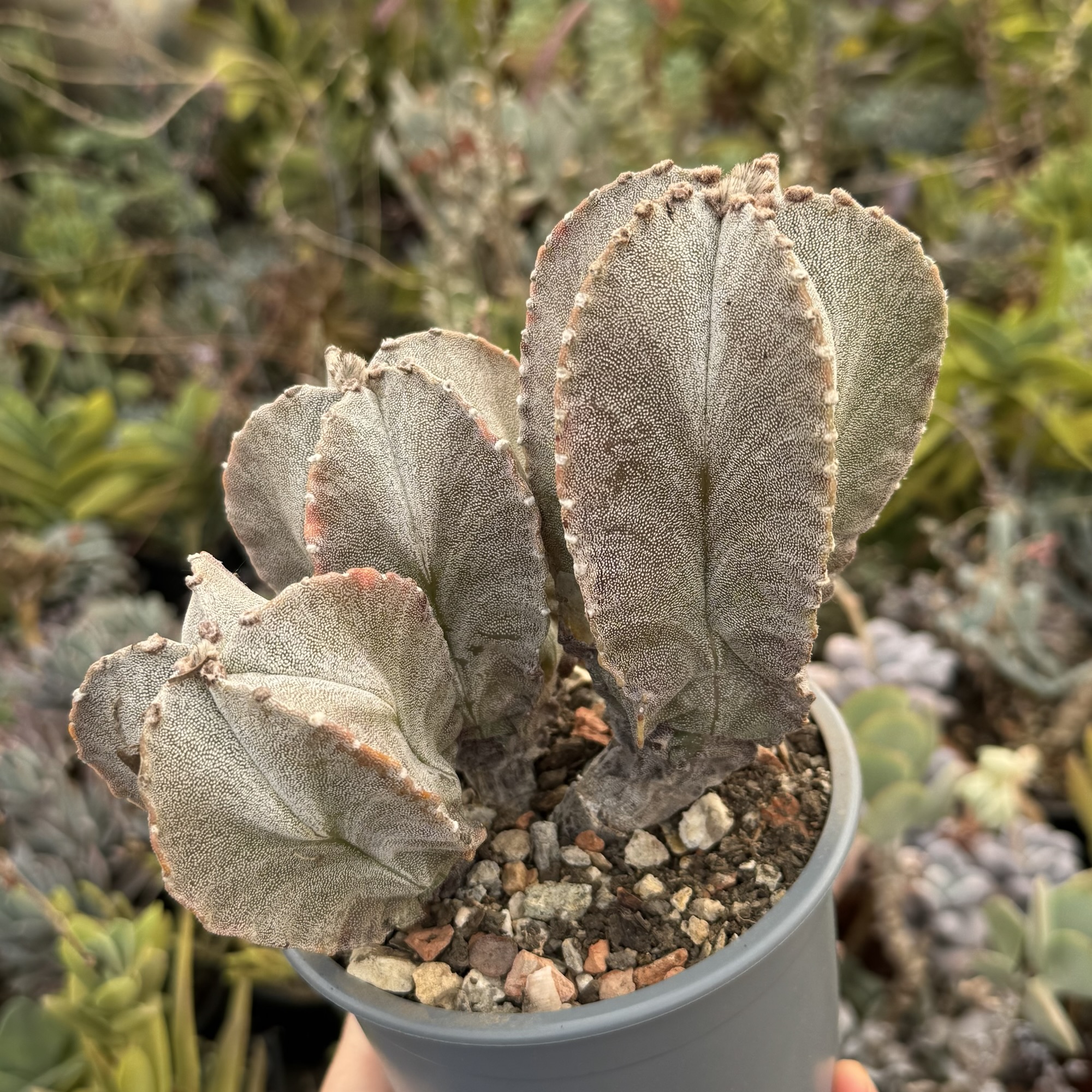 Cu o vârstă estimată la aproximativ 15 ani, acest cactus a crescut lent și sănătos, dezvoltând o formă rar întâlnită și foarte apreciată de colecționari. Fiecare cap are propriul ritm de creștere, oferind un aspect natural, armonios și unic.