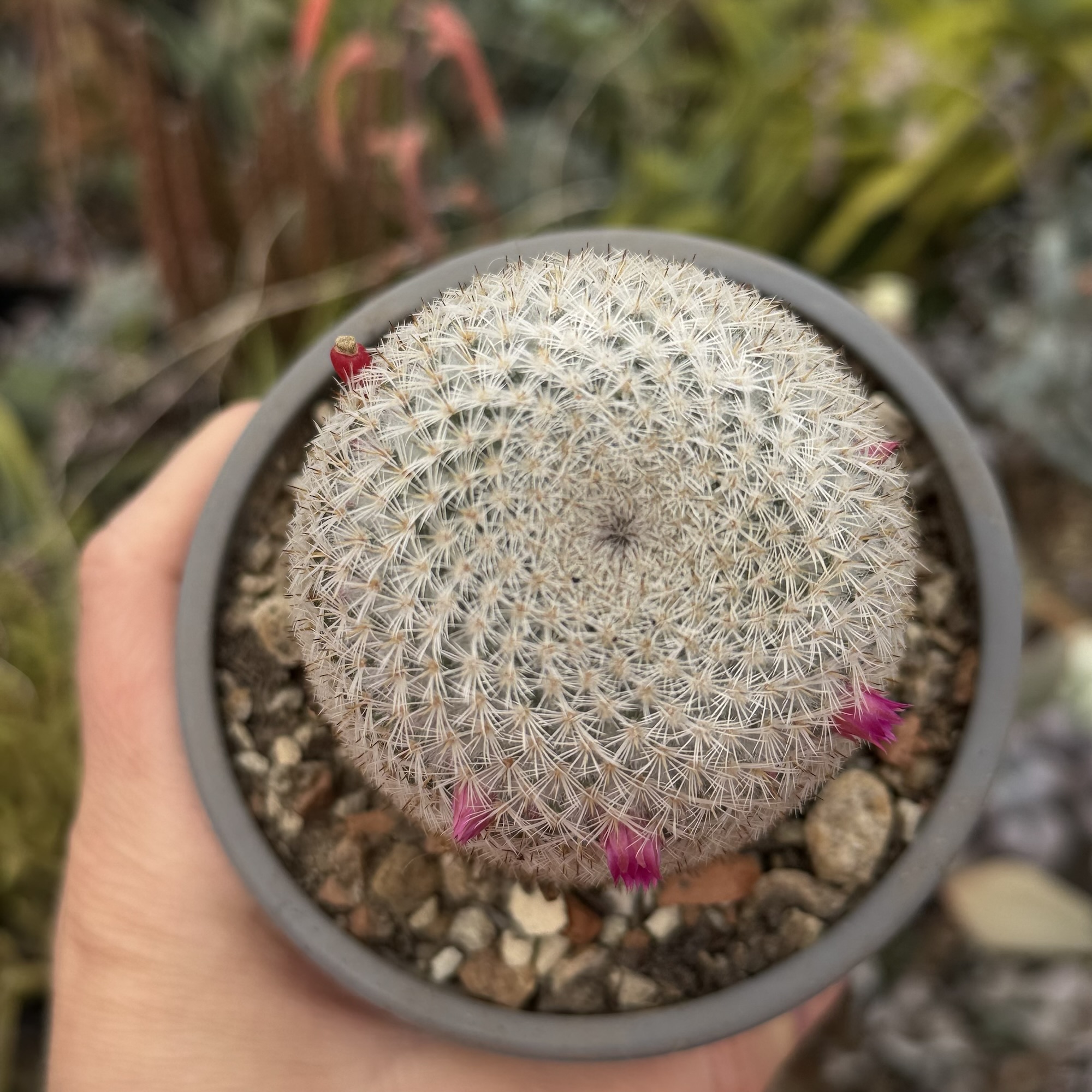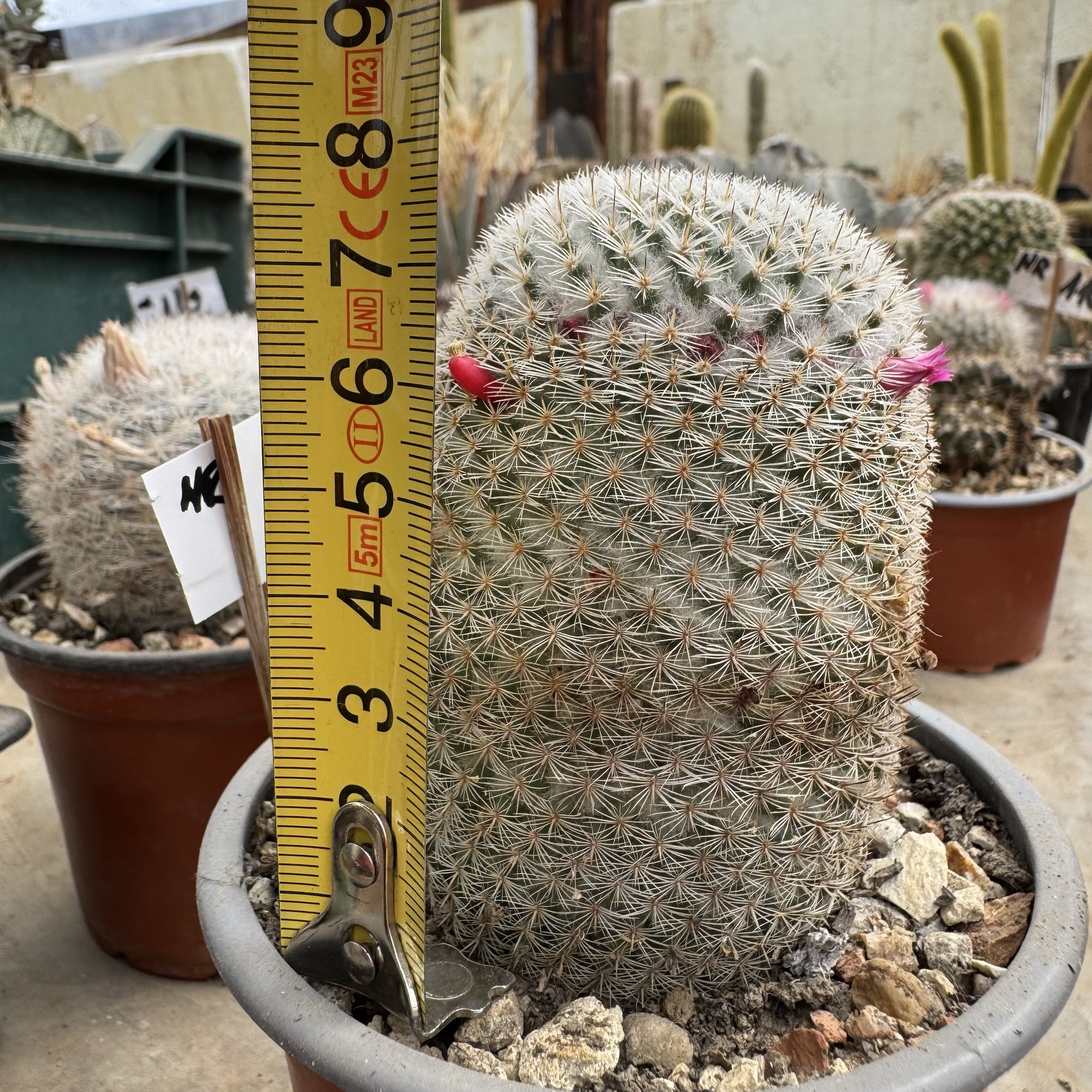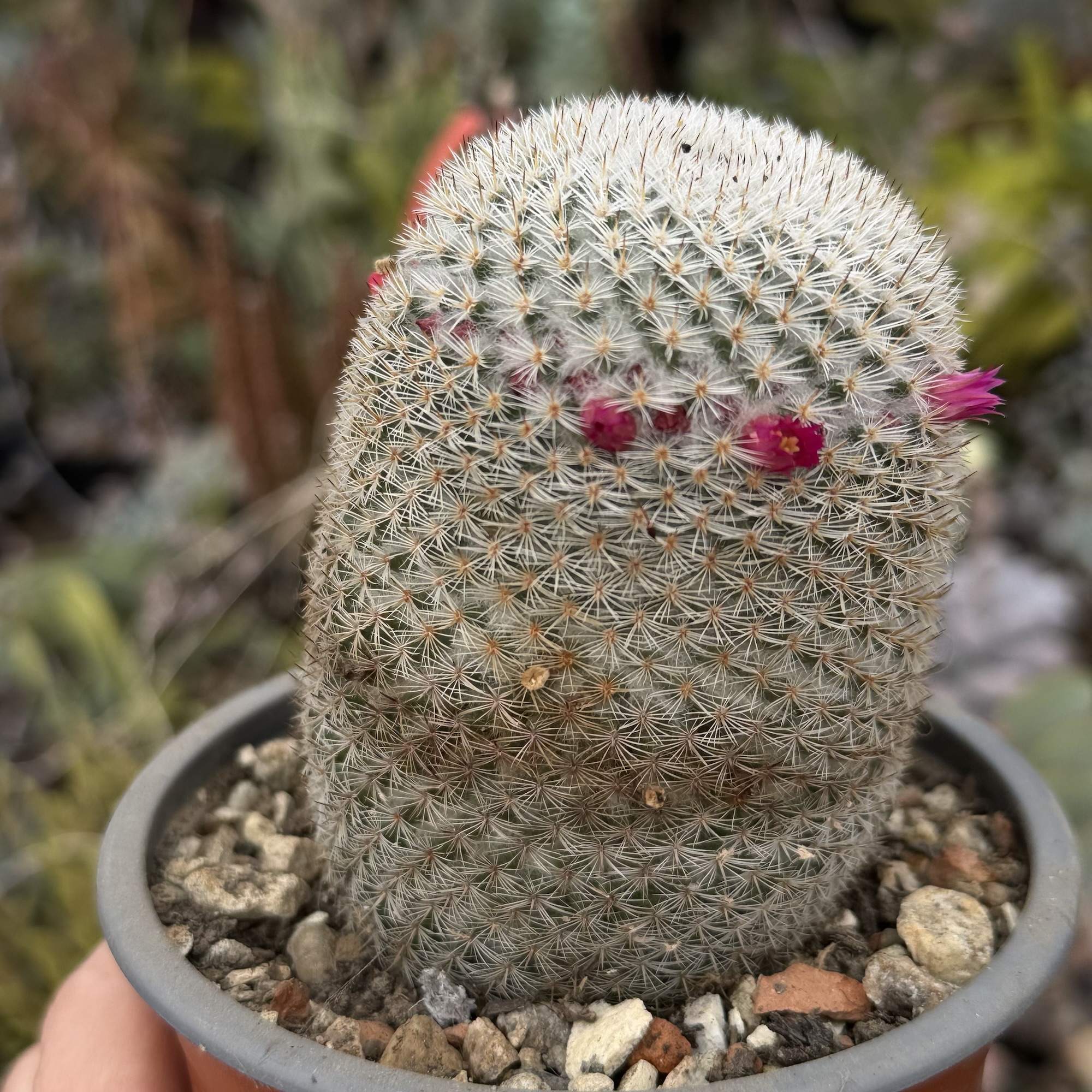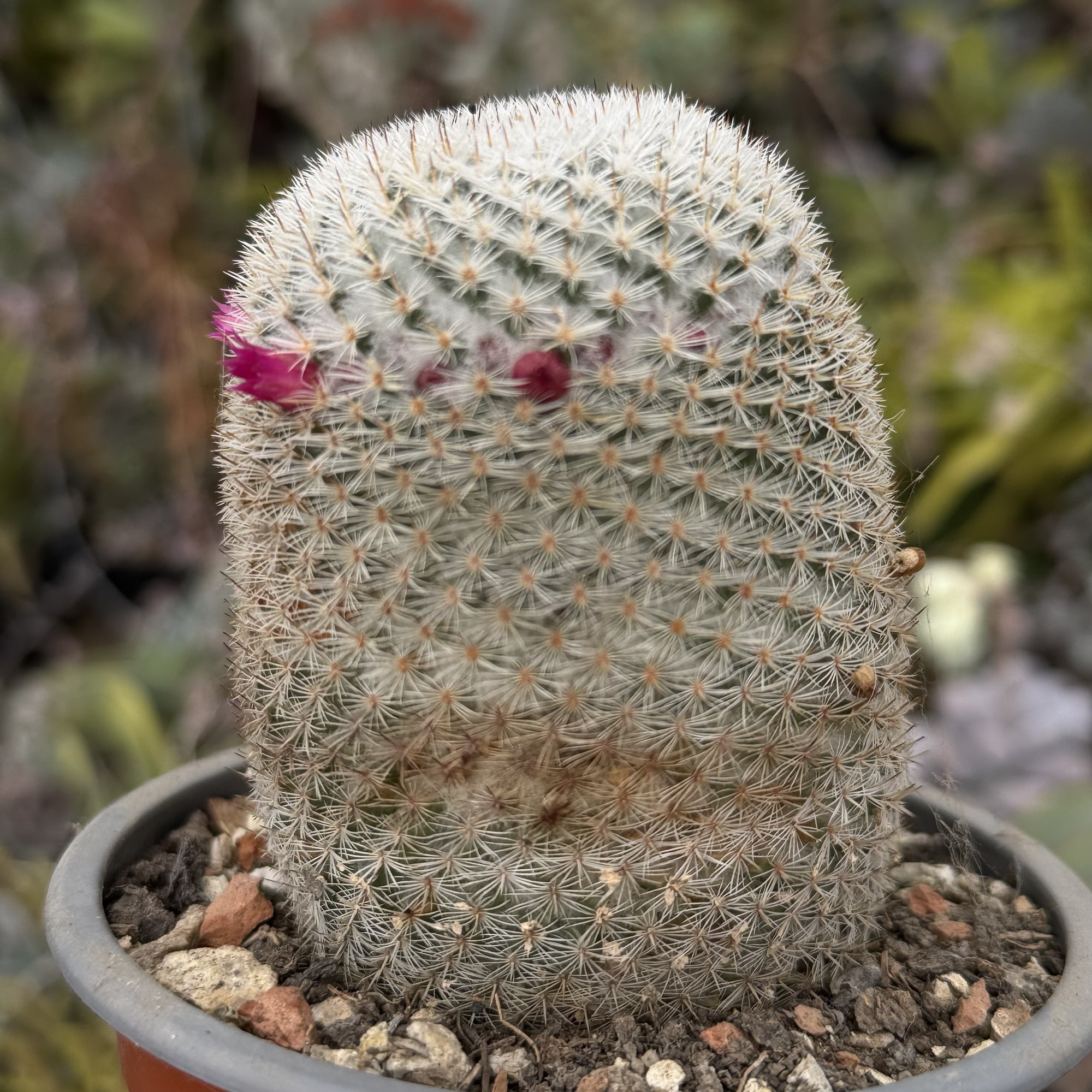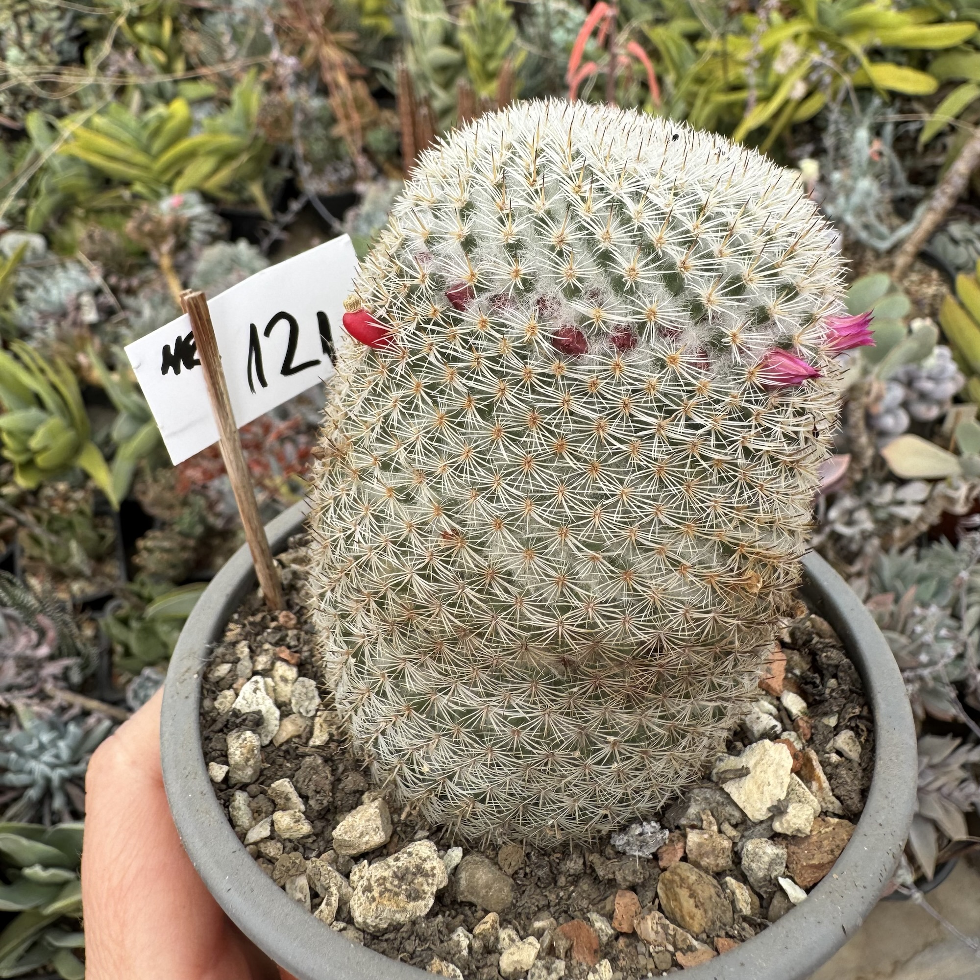 Mammillaria este un cactus ornamental apreciat pentru textura sa densă de spini fini și pentru înflorirea sa deosebită. Exemplarul de față este matur, bine dezvoltat, cu formă cilindrică compactă și aspect uniform, rezultat al unei creșteri lente și naturale.